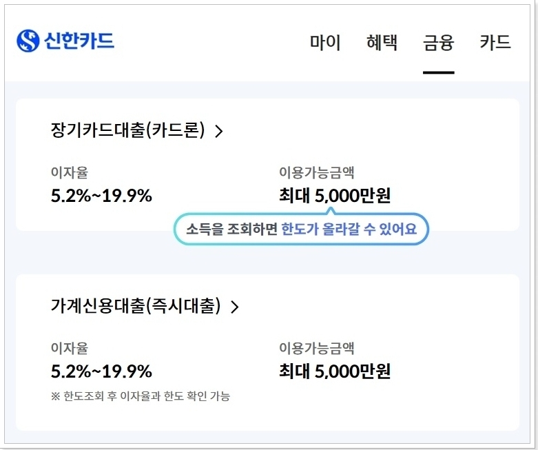 신한카드 카드론을 신청하려면 기본적으로 신한카드를 보유하고 있어야 해요. 카드 이용 실적이나 신용등급도 함께 고려되기 때문에 최근에 카드 사용 실적이 적거나 신용 점수가 낮다면 원하는 한도나 승인 결과가 다를 수 있어요.